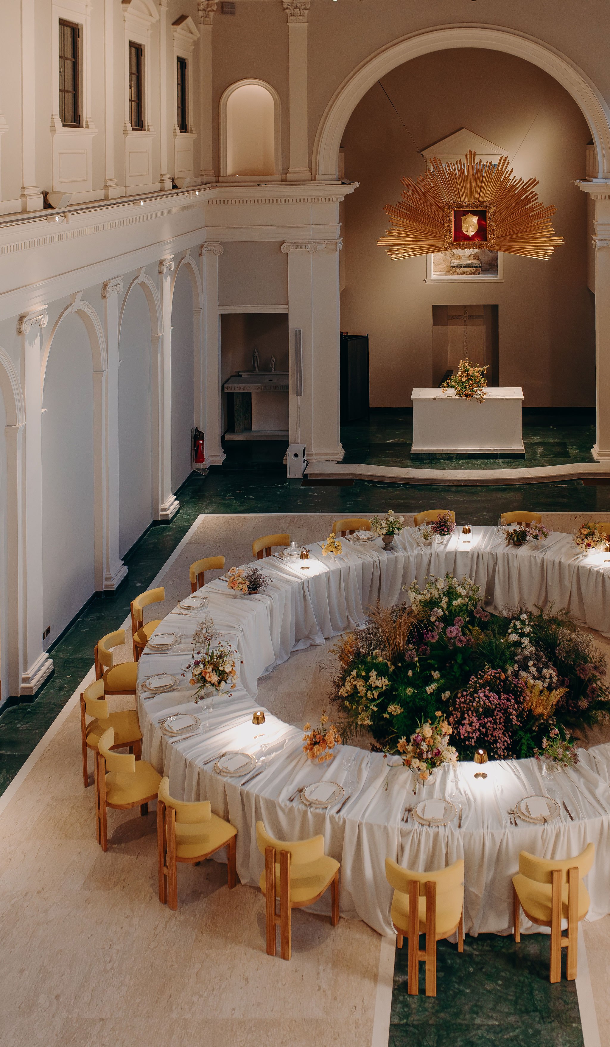 Some places speak before you even begin to work. Collegio alla Querce, in Florence, is one of them. A former chapel transformed into an exceptional event venue, its white arches, green marble floors and gilded wooden sunburst create a setting of rare majesty. In April 2025, we had the privilege of designing the florals for an extraordinary editorial here, alongside an incredible team of vendors.